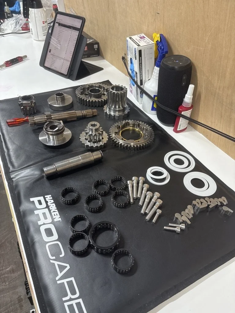 Once reassembled, each winch undergoes rigorous testing in all gears to verify proper functionality and performance. A WinchWorkshop Service label is affixed to the housing, displaying the service date, technician details, and a link to the service report.